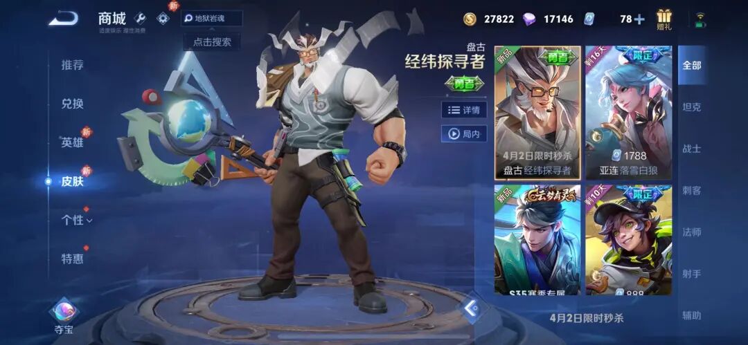在进入四月份之后,王者荣耀首先在2号迎来盘古秒杀皮上架,那就是经纬探寻者了。没错,盘古自从在前年春节的时候,上架一款累充史诗限定之后,就没有新皮肤消息。如今,盘古6元秒杀皮肤上架,还是值得入手的。毕竟,在王者荣耀中,已经有各种“老师”皮肤存在了,不知道后续王者荣耀还会上架什么校园皮肤呢?在我看来,王者荣耀四月份将迎来皮肤雨,同时近期更有两款1788限定皮肤返场哦,分别是橘右京枫霜尽以及狄仁杰的狴犴令哈。