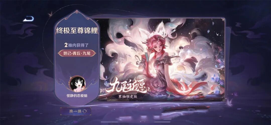 不得不说,这次九尾祈愿活动,欧皇玩家直接是赚翻了啊。没错,这位欧皇玩家,直接是两抽内就获得了妲己青丘九尾皮肤,而且还被王者荣耀评为“终极至尊锦鲤”的称号。毕竟,妲己九尾皮肤的爆率只有1%啊,而且能够单抽出妲己九尾皮肤的玩家,估计就只有这位玩家了吧?在我看来,王者荣耀九尾祈愿活动中,大部分的玩家都是在400-700之间出的皮肤吧?各位玩家们,你们都是多少抽到妲己九尾皮肤的呢?记得有什么想说的话,在留言区跟我交流沟通哈。