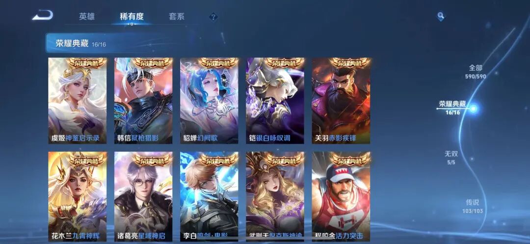 不得不说,王者荣耀的皮肤数量还是很多的,一年的新皮肤数量也有几十款之多。而随着2024年的开启,王者荣耀至今已经上架20多款新皮肤了。现在拥有591款皮肤的玩家,估计也很少吧?毕竟,王者荣耀中还包含了限定品质的皮肤,一旦下架之后就很难返场,除非是人气限定皮肤。当然了,王者荣耀这些皮肤当中,如果要说品质最高的,应该还是荣耀典藏了。没错,王者荣耀的典藏皮肤,是需要积分夺宝的荣耀水晶兑换的。而至今,王者荣耀已经上架了16款典藏皮肤,跟一位氪金英雄武则天哦。