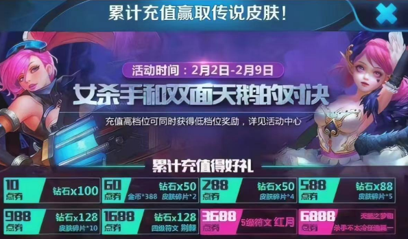 这还不止,王者荣耀放大招,在当时官方甚至是上架了另外一个活动,那就是6888点券喜提典藏2选1的宝箱。没错,王者荣耀的孙尚香不太冷和小乔的天鹅之梦,在远古版本中,皮肤品质只是传说而已。而且,当时王者荣耀为了回馈玩家的支持,甚至是让玩家做选择。只需6888点券必得典藏2选1的机会,不知道玩家们选择哪一款呢?再到后来,相信玩家们都知道了,王者荣耀优化这几款累充皮肤,将品质升级到荣耀典藏,需要一颗水晶才能获取。所以,如今这几款典藏皮肤价值2千,就连V10氪金玩家都后悔了。