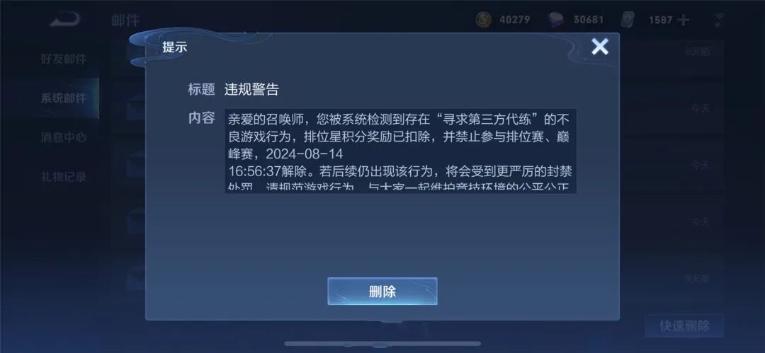 没错,该代练玩家在隔天准备巅峰赛的时候,上线收到官方的邮件。可以看到,王者荣耀的邮件给出的惩罚理由是“第三方代练”,而且惩罚手段是禁止排位赛和巅峰赛。不仅如此,该玩家账号所上的星数积分都被扣除。也就是说,代练一晚上的努力都白费了,而且还要被禁止参加匹配到八月份。