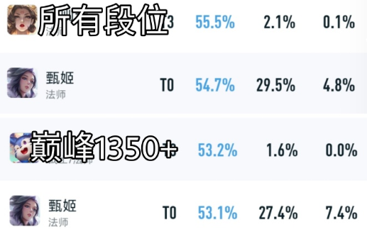 而在甄姬登场这段时间内,她的胜率无论是全段位还是巅峰1350+的分数,都是排在了第二名位置哦。在我看来,新版甄姬主要是解决了无法单挑的弊端,而且一技能能极大提升甄姬的生存能力哦,不知道是不是有新皮肤或者限定返场啊,哈哈。