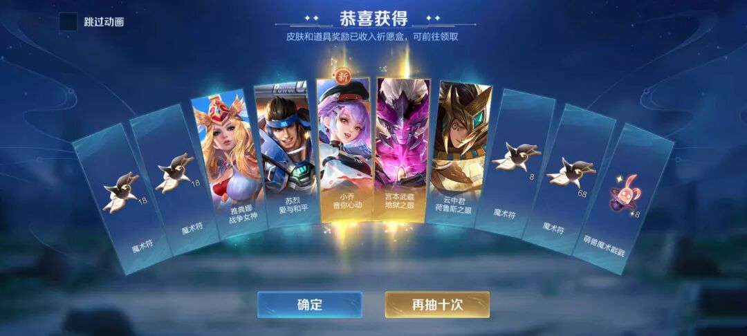 可以看到,这位玩家十连抽之后,直接是获得了五款皮肤,其中还有小乔和宫本武藏的传说。这波要是换算成魔术符的话,基本是能顶一个无双券了啊。除了抽到五款皮肤的玩家,还有的直接是抽到了韩信群星魔术团哦,简直炸裂。