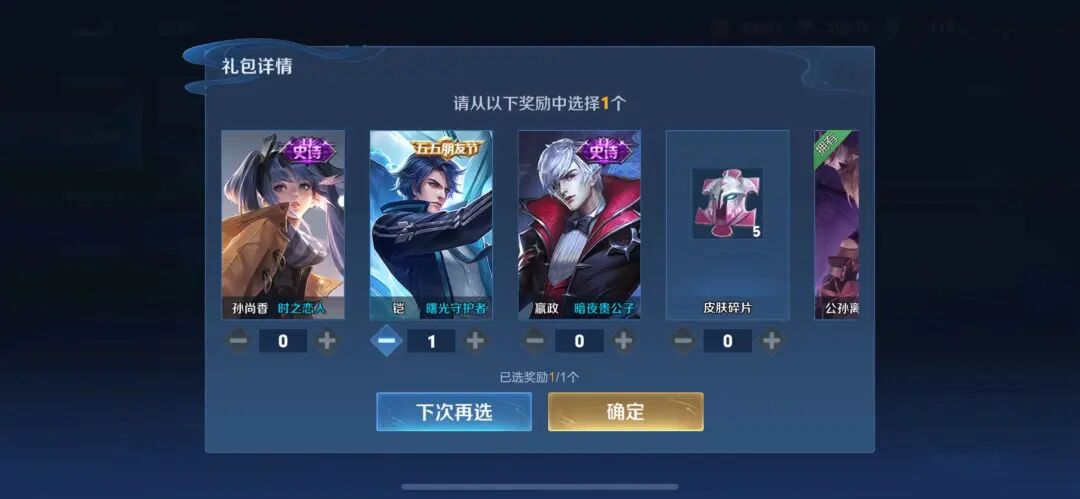 王者荣耀这次五五朋友节中,是上架了多款新皮肤,同时也有玩家能够领取的免费皮肤哦。没错,第一个就是永久史诗记得领,是一个自选宝箱,里面拥有孙尚香时之恋人、铠爹曙光守护者、嬴政暗夜贵公子等等五款史诗皮肤。