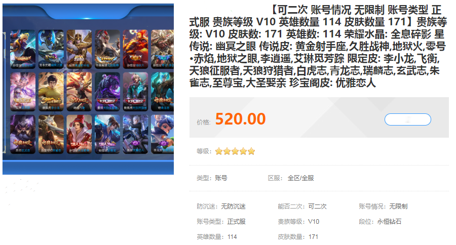 我们可以看到,该账号 拥有9款传说皮肤,其中限定的话,只有李逍遥和白虎志以及猴子的赤焰皮肤哦。这样来说的话,该账号的价值其实并不高,只是花了18万点券而已。但是呢,520买V10账号,再加上171款皮肤以为是捡到宝了,结果看到邮件不乐意了,这是为什么呢?