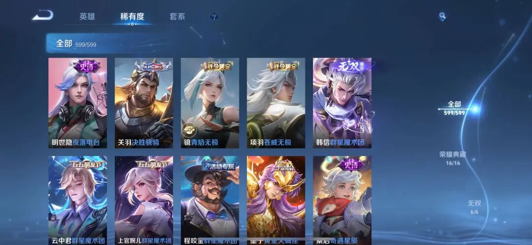 王者荣耀至今已经快要到九个年头了,估计很多玩家都是在S4或者是S5才入坑的吧?时至今日,王者荣耀依旧保持着手游的龙头地位,毕竟当初进入的玩家少说也有上千万吧?而这其中,还不缺乏氪金玩家。这不,王者荣耀现在有600款皮肤了,而全都拥有的,全服估计都不超过10个吧?