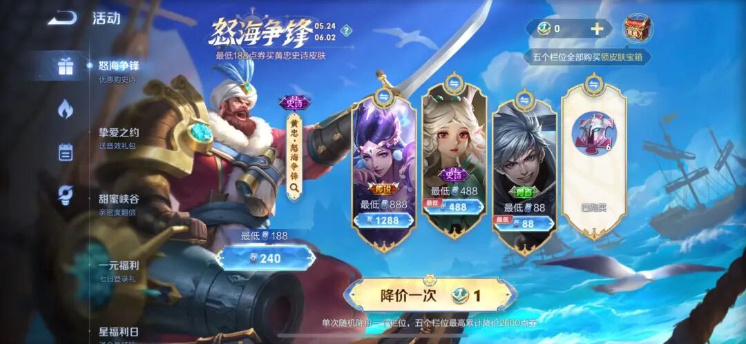 其实呢,王者荣耀在今年开始之后,对于新皮肤是进行了折扣。比如说,十款传说皮肤中,就有七八款是享有432点券的折扣,而有的史诗皮肤,王者荣耀也会降价到488点券或者是188点券,以便让玩家获取哦。朵莉亚和海诺的情侣皮肤就是如此,还有黄忠的怒海争锋皮肤,最低也是188点券就能到手的哦。其实呢,王者荣耀对于折扣新皮肤,主要是想让玩家多进行一些日活任务。