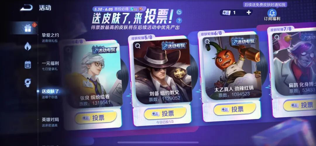 不知不觉,王者荣耀接下来的皮肤返场,采用的是投票方式和。而每年都必定会返场的活动专属皮肤,也是被王者荣耀做成了投票返场。没错,这次的限定皮肤投票返场,一共是有八款之多。只要最终的票数谁最多,王者荣耀就会返场谁。不过,从王者荣耀目前的票数来看,刘备的纽约教父皮肤票数最多,返场的概率应该很大了。