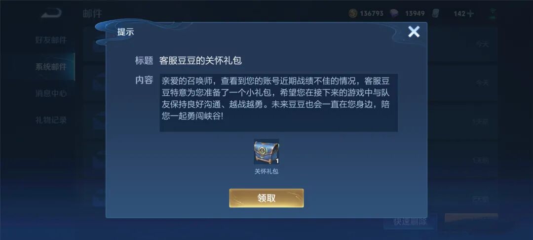 而这个关怀礼包补偿,里面主要是铭文碎片和钻石了。当然了,有些玩家说王者荣耀会补偿荣耀积分或者荣耀水晶的,纯属是不真实的。毕竟,王者荣耀还没有这么“大方”啊,哈哈。言归正传,该玩家以为天游会补偿礼包,结果看到邮件哭了啊。