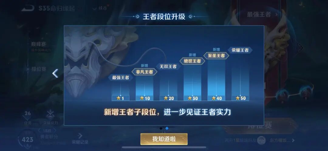 相信玩家们都知道,王者荣耀现在的段位是越来越多了,从之前加入的星耀段位,再到如今的最强王者段位进行细分。不得不说,王者荣耀对于玩家的游戏体验还是有自己的理解。另外呢,S35赛季中,王者荣耀加入了非凡王者、绝世王者以及至圣王者这三个小段位,并且每个段位所需要的星数都是不一样的哦。基本上,每隔10颗星,玩家们的段位就会发生变化。