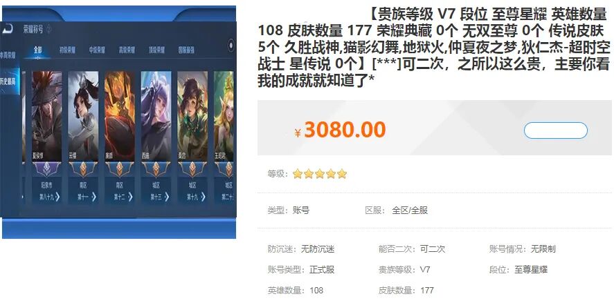 众所周知,王者荣耀现在的段位并不算太难,尤其是上了最强王者之后,基本上是掉不下来的。当然了,有些玩家则是上了王者段位之后,选择等待新赛季的到来。毕竟,王者荣耀S36新赛季,将会更新更多好玩的内容,到时候估计会有很多玩家回归的。当然了,这些退游的玩家账号,都是被别人给收走了。比如说这位老玩家买王者号,不过该账号只是贵族V7,甚至英雄皮肤只有177款就要价3K。