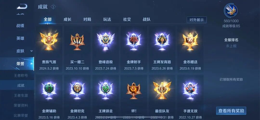 当初很多玩家都为了达到80级获得动态头像框,都纷纷化身肝帝,但后来随着王者荣耀其他系统上线,成就系统就没有多少玩家注意了。不过,这位玩家账号完成的成就,估计全服只有他拥有了。“英雄万花筒”成就,而且还是金牌的,意味着什么呢?没错,这个成就需要拥有90个英雄称号,才能获取哈。