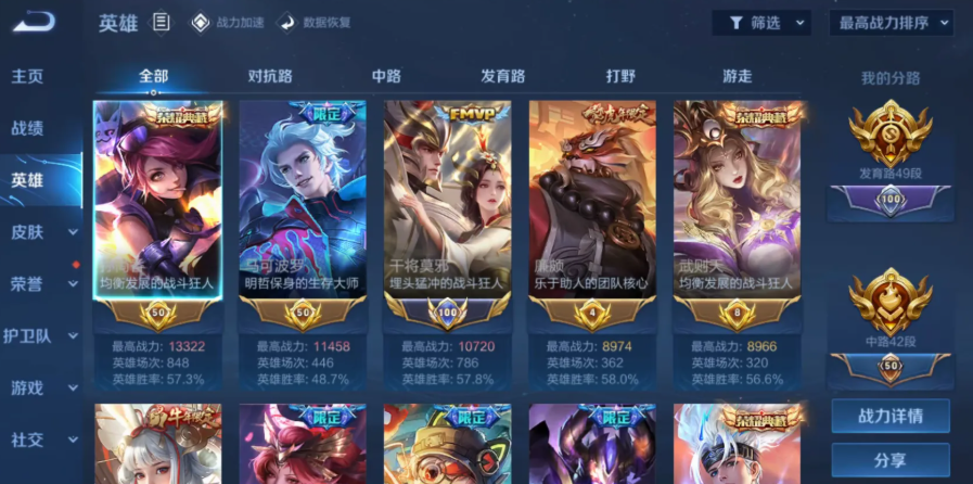 王者荣耀账号的价值,除了英雄皮肤之外,还有就是英雄战力了。毕竟,要是有一个国服标签的话,那就是稳赚的啊。我们可以看到,这个V10玩家的英雄主页中,只有干将莫邪的一个小国标,其他都是省级的标哦。