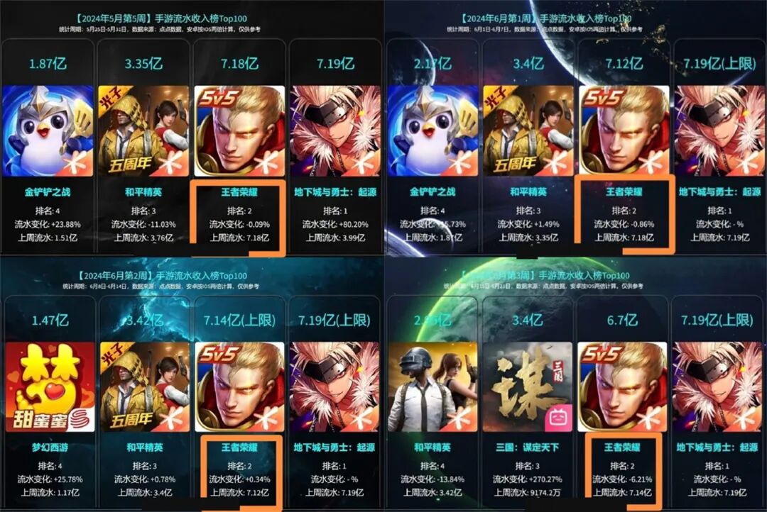 可以看到,DNF手游上架这段时间以来,王者荣耀的流水收入都是排在了第二名。也正因为如此,王者荣耀天美祭出三项福利,为的就是留着老玩家。