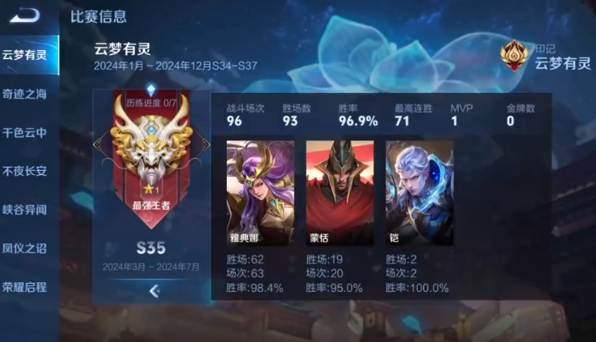 该玩家收获了另外一样东西,其实就是最强王者段位和英雄高胜率回报了。我们可以看到,该玩家96场排位赛,胜率高达96.9%,也就是只输了三场而已。再看该玩家使用的英雄,就明白为什么信誉分会大残了。