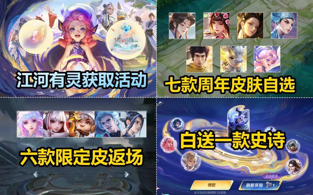 第三是周年庆当天,玩家登录王者荣耀,就能够获得一款免费史诗皮肤哦。第四则是明年的周年庆皮肤自选获得,到时候第二到第八周年庆皮肤,能够任选其一获取哈。第五个福利,就是前面说到的甄姬、西施的至美系列皮肤哦。