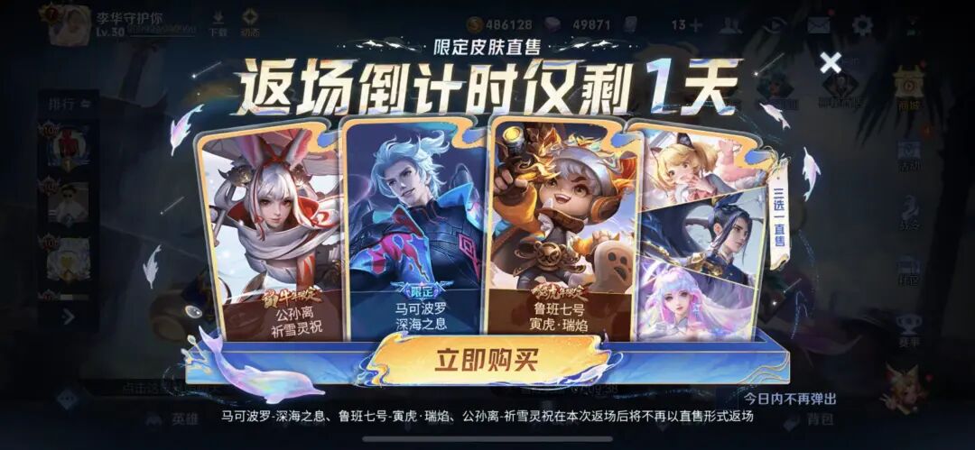 另外一方面,王者荣耀在八周年庆中返场的六款限定皮肤下架,不知不觉已经过去了七天。而在我看来,这六款限定中,公孙离祈雪灵祝、马可波罗深海之息以及鲁班瑞焰皮肤,都是要入手的,不然后续只能用双倍价格入手了。