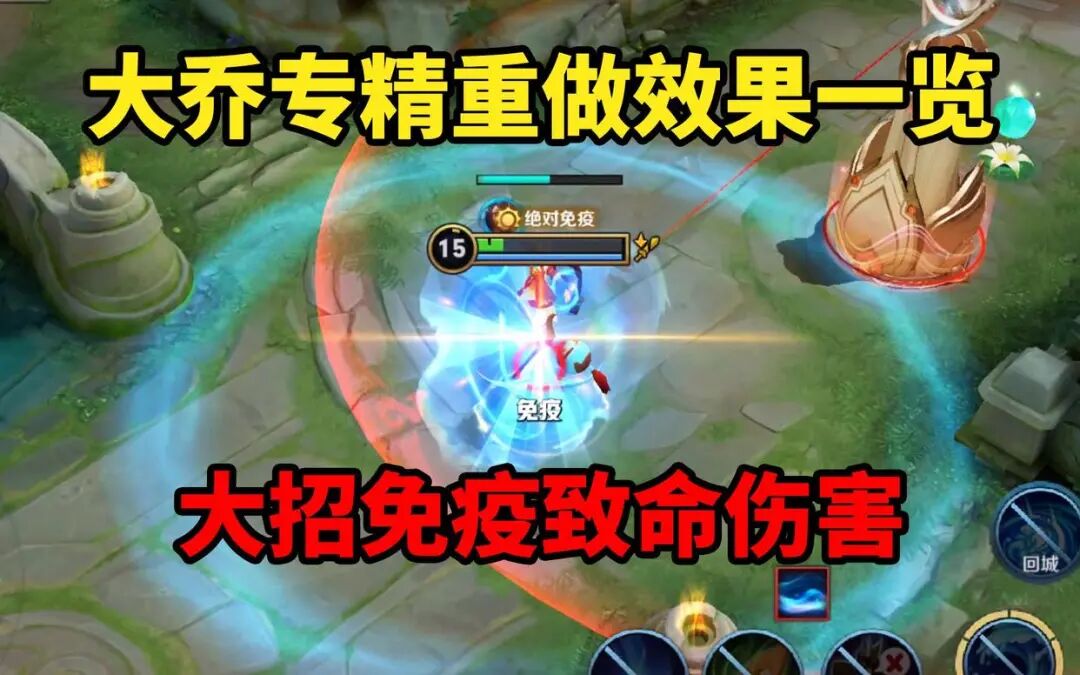 最关键的, 应该是大乔的大招了,当大乔处于受到致命伤害之后,会自动传送回家哦,而且还能传送回来。说白了,就是新版大乔专精装之后,大招能够触发无敌效果,相当于名刀了。只不过,触发无敌之后,大招的冷却时间将会增加很多哦,所以要慎用。