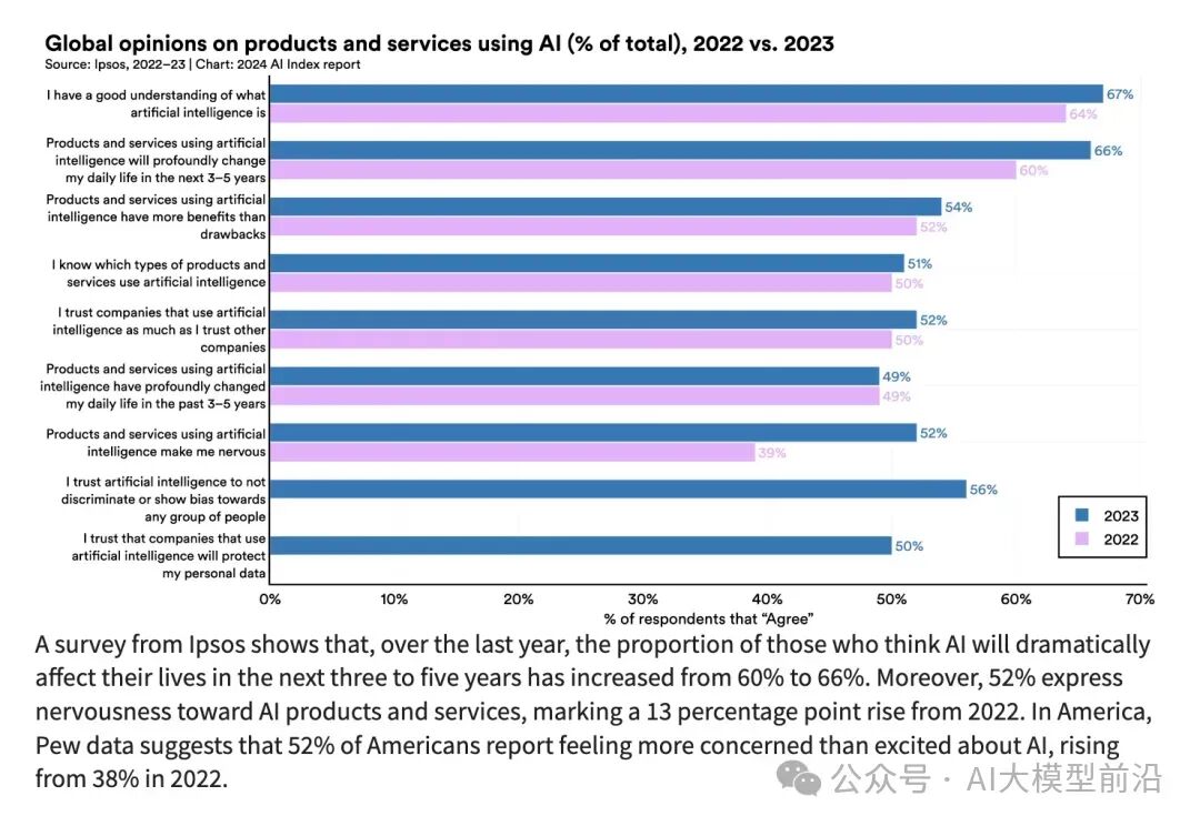 根据市场研究公司Ipsos的最新调查,过去一年里,认为人工智能将在未来3-5年内深刻影响他们生活的受访者比例从60%攀升至66%。同时,有52%的人对人工智能产品和服务表示担忧,这一比例相较于2022年增长了13个百分点。