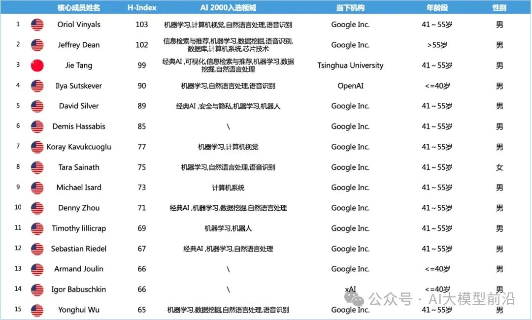 十个大模型团队中不乏学术贡献卓越的学者,其中有 86 人被评为“AI 2000 全球人工智能学者。下表列举了 H-index 前 15 名核心成员,最高 H-index 达 100,对学术领域做出不可忽视的贡献。