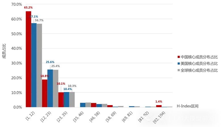 图|中、美、全球十个大模型核心成员 H-Index 分布
