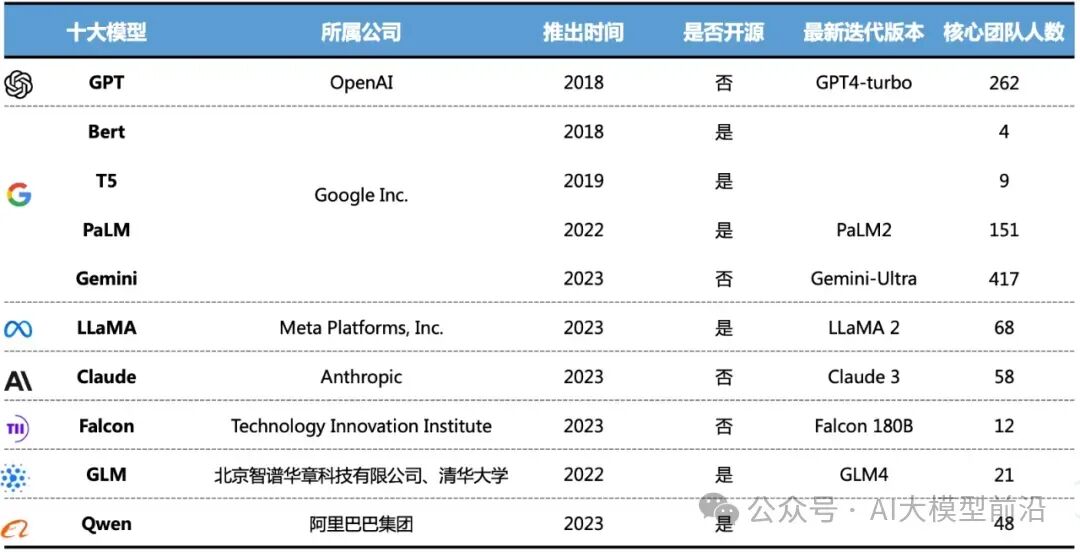 该报告分析了全球十大模型(GPT、Gemini、Claude、GLM、LLaMA、Qwen、Falcon、PaLM、BERT、T5)的核心成员,涉及地域、年龄、教育、华人占比和学术影响力。主要结论如下: