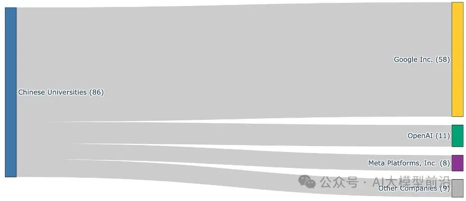 全球十大模型的核心成员多来自著名高校,前十大高校输送了573位人才,占总人数的59.2%。美国加州大学系统和斯坦福大学最多,分别输送了11.7%和9.7%的人才。清华大学位列第七,输送了5%的人才。印度理工学院也贡献了2.2%的人才。其他如麻省理工学院和卡耐基梅隆大学也有贡献。总之,全球高校为人工智能领域输送了大量人才,为模型发展奠定了坚实学术基础。
