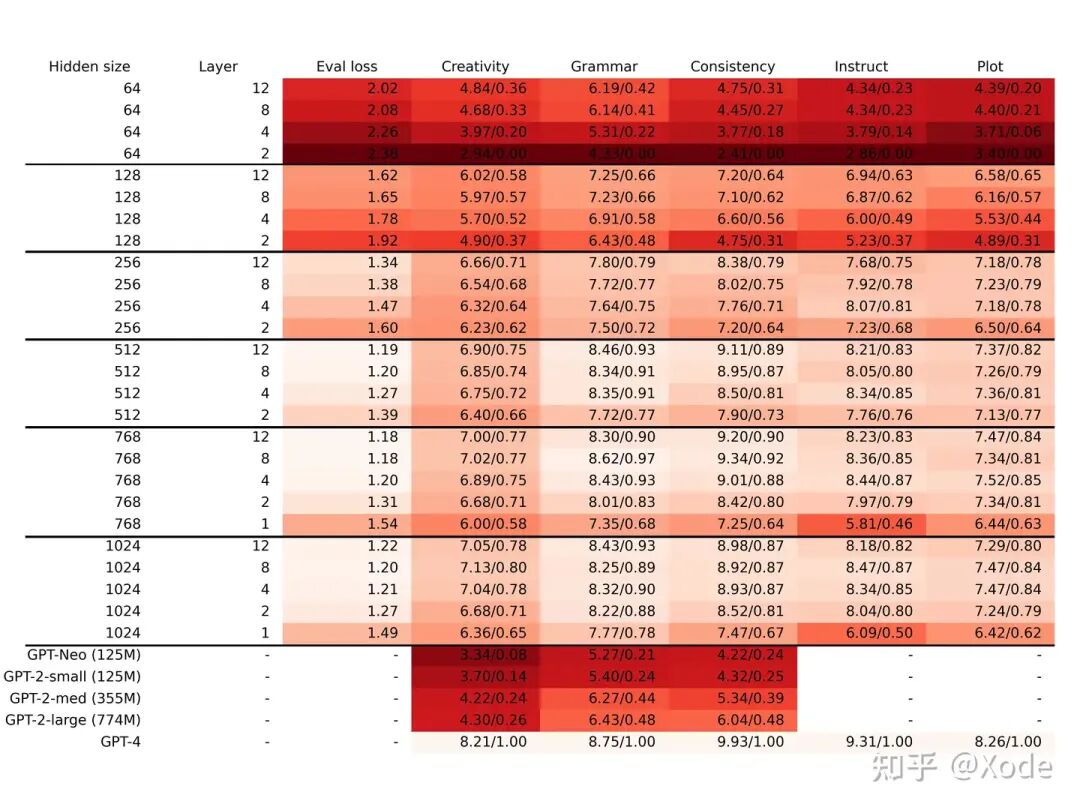 架构确定了,那么现在来探讨一下模型具体参数,比如隐藏层大小、隐藏层数等等。我们先来看看 TinyStories 原工作的实验结果:
