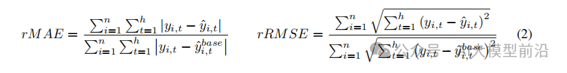 本文研究了基准测试中的性能分析,涉及基线、统计、机器学习和神经预测模型。基线和统计模型基于历史值训练,机器学习采用全局和深度学习,排除了Prophet和ARIMA等模型。评估指标包括相对平均绝对误差和相对均方根误差,这些指标以季节性朴素模型为基准归一化,提高了结果的可解释性,并有助于比较不同频率的结果。为确保数值稳定性和评估一致性,这些指标进行了全局归一化处理。具体计算见方程2。