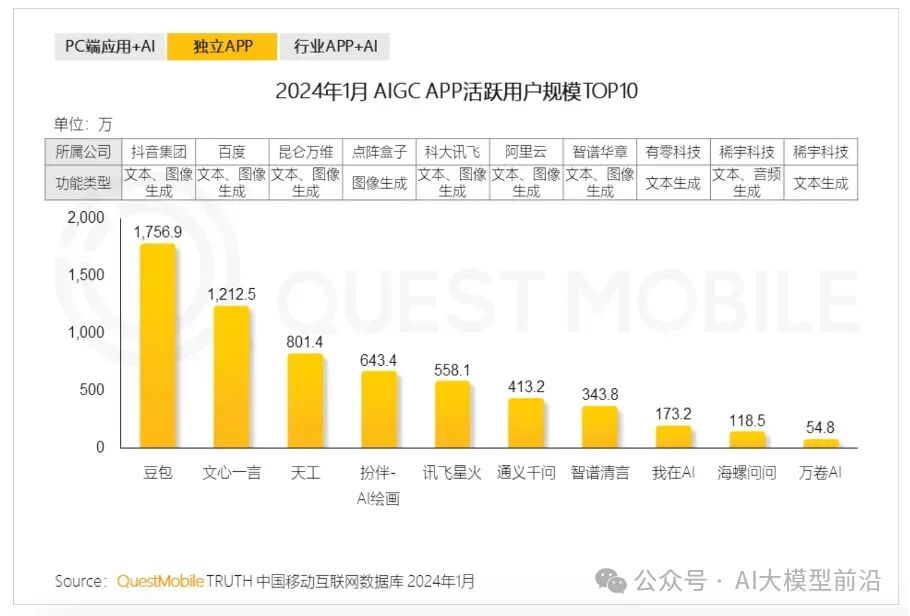移动互联网时代的APP用户数量庞大,但中国AI原生APP增长相对较慢,目前头部的APP月活用户刚刚突破千万。即使在互联网圈,也有很多人没有使用过这些APP,特别是在三四线或更小的城市。根据QuestMobile报告,头部APP应用去重月活用户突破5000万,这些应用主要集中在文本和图像生成领域。其中,豆包、文心一言等应用以月千万活跃用户规模领先,其次是天工、扮伴-AI绘画及讯飞星火等应用。