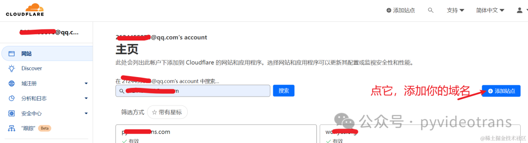 首先你需要把你的域名NS服务器修改为cloudflare的,等待生效后,回到cloudflare首页 https://dash.cloudflare.com ,绑定你的域名