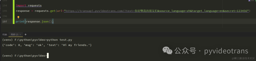 import requests response = requests.get(url="https://transapi.pyvideotrans.com/?text=你好啊我的朋友们&source_language=zh&target_language=en&secret=123456") print(response.json())