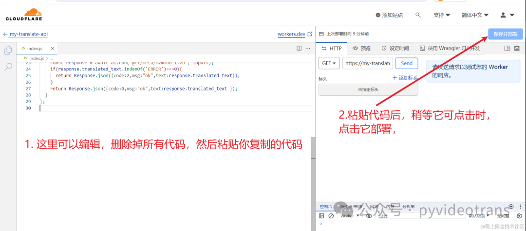 点击上一步最后显示的“编辑代码”,等待页面显示,然后删掉左侧所有的代码,并粘贴以下代码到左侧,其中的 123456是你的访问密钥,可以修改下,防止他人使用浪费你的免费流量。 代码也可以去 github.com/jianchang512/translate-api 复制