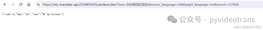 好了,可以愉快的使用了,比如我部署后的地址是 https://my-translate-api.2124455076.workers.dev/,那么我直接通过这个地址就可使用