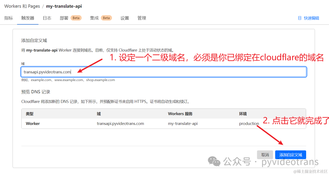 如下图所示,先点击“触发器”,再点击“添加自定义域”,就可以添加自己的域名了,比如你已绑定到 cloudflare的域名是 abc.com,那么这里可以设定 api.abc.com,