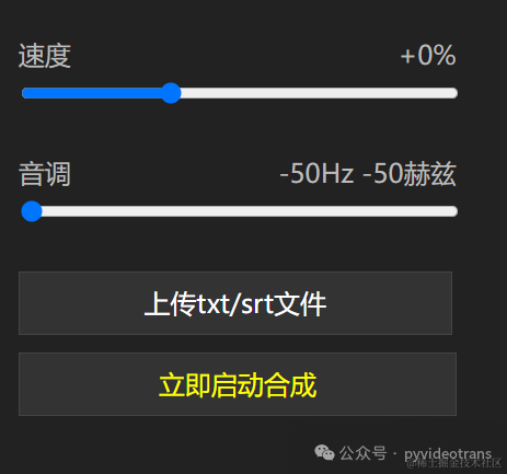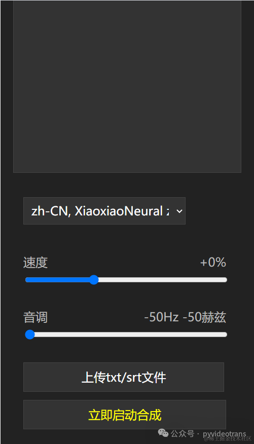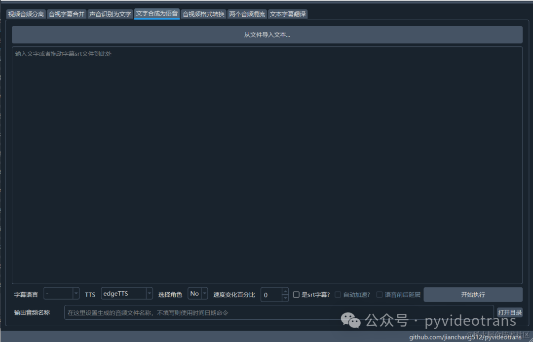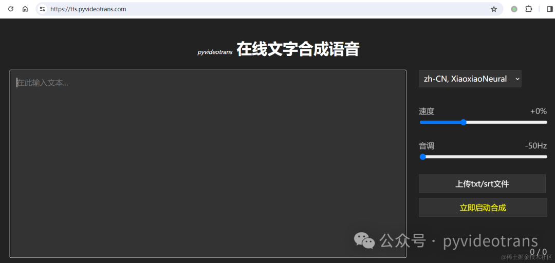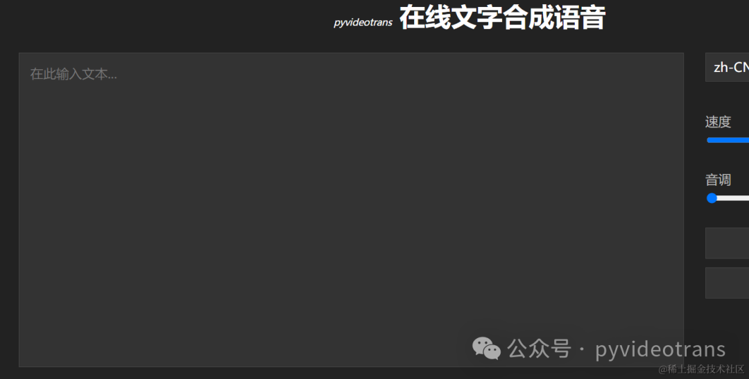 但有时仅仅想合成一段文字,使用该软件可能显得有点庞大,在没有安装该软件的电脑上,也不方便使用,单独下载的话体积将近2G,比较耗时,因此专门开发了一个简单免费无限制的“在线文字合成语音”网站,使用edgeTTS将文字合成语音。( https://tts.pyvideotrans.com )