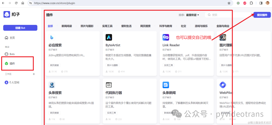 插件: 这里面是一些辅助工具,比如搜索、代码执行器,在创建自己的AI应用时可以直接嵌入,让你的应用功能更强大。当然有能力你也可以创建自己的插件提交哦。