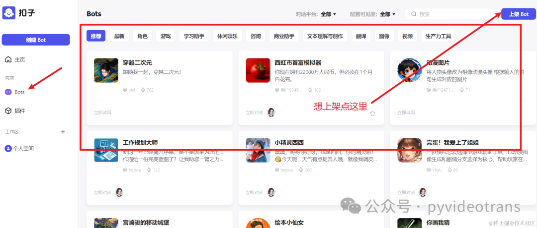 Bots: 这是已创建好的AI应用,有官方的,有第三方的,点击就可以使用了。当然你也可以创建好自己的AI应用后,尝试在这里上架哦,让更多人使用你的应用,成就感满满。