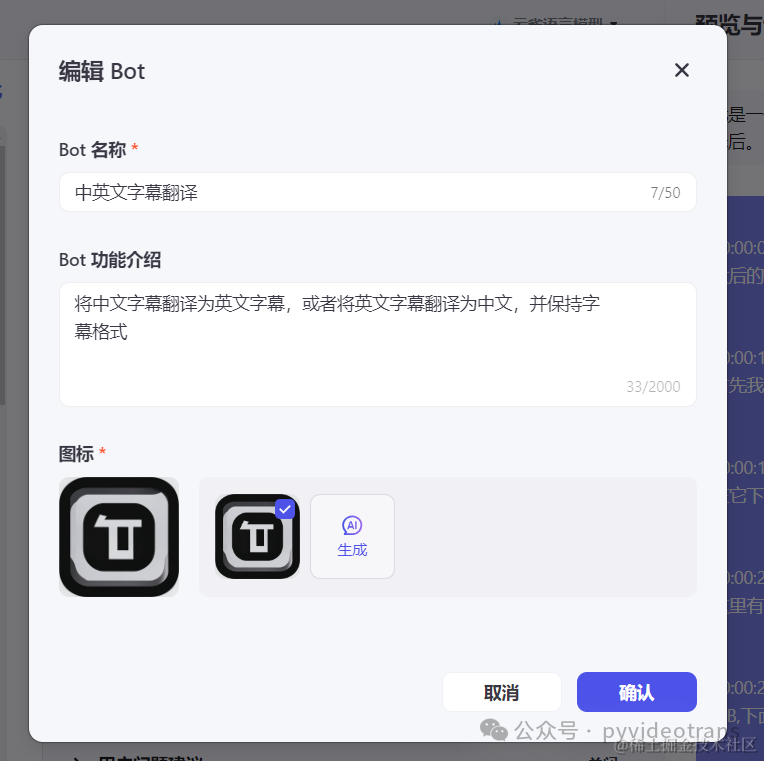 1. 点击“创建Bot”按钮。在弹出的浮层中填写这个AI应用的名称、介绍,还可以AI自动创建logo。
