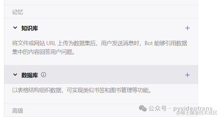 知识库和数据库:本质是为你的AI应用喂更多自己的数据,点击+号,按照要求的格式填充数据,当然我这里也是用不到它的。
