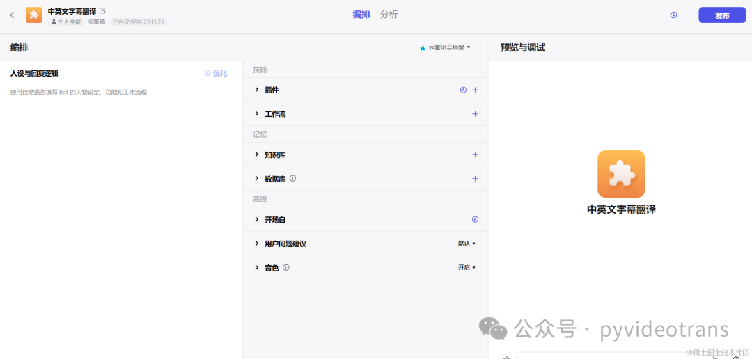 之前一直在使用 coze.com,白嫖 GPT4-128k 爽歪歪,只是得一直科学上网,使用不方便,好在终于出了 coze.cn 国内版了,虽说云雀语言模型不像GPT4金光闪闪,但也大差不差,何况白嫖最爽。