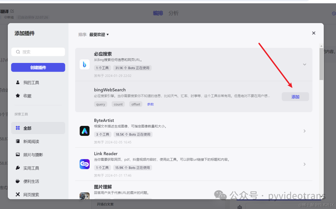 插件:点击插件行右侧+号,弹出插件列表,可以选择想使用的添加,当然我的字幕翻译用不到,所以没有添加