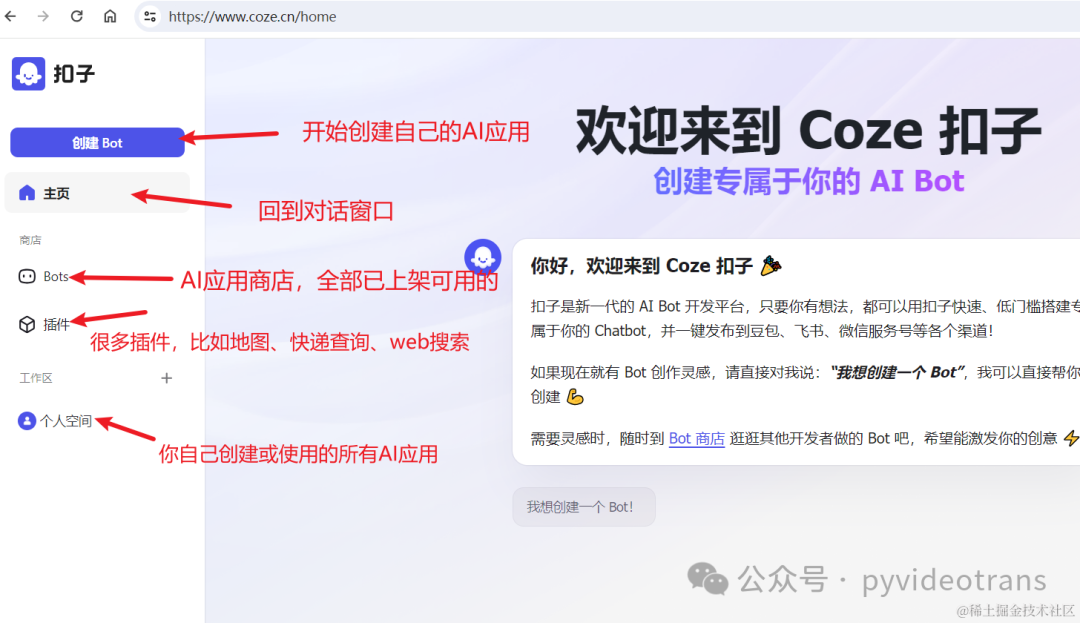创建Bot: 创建你自己的AI应用就从点击它开始。