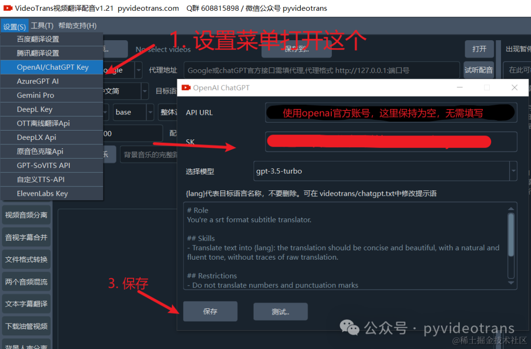 5. 在视频翻译配音软件中使用,点击左上角 设置菜单-OpenAI/ChatGPT , 在SK中填写你复制的 secret key,其他保持默认,在使用OpenAI官方账号时,无需填写“API URL”,为空即可,然后保存。
