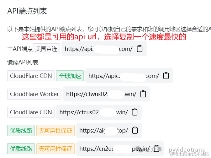 比如我使用的第三方api,在页面中提供了这些 api url,我经过本地测试后,选择复制了一个速度最快的,填写到软件的 “API URL” 后的文本框中