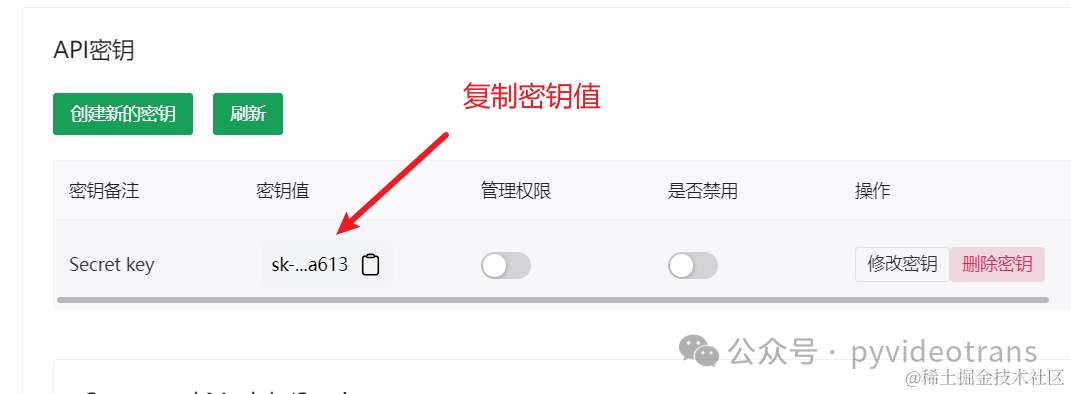 1. 比如我已经购买了某个第三方的api,找到 密钥(secret key) 所在位置,创建并复制