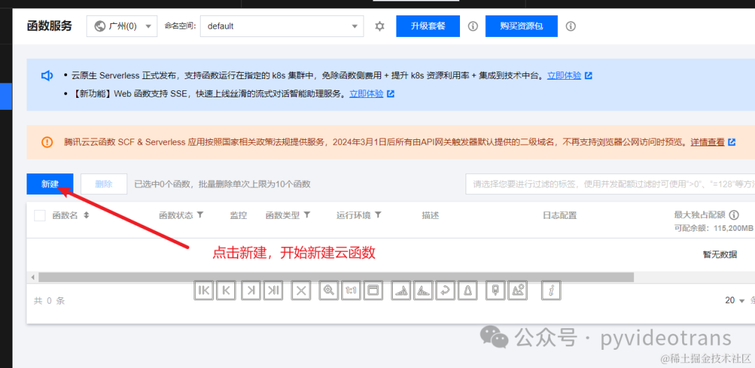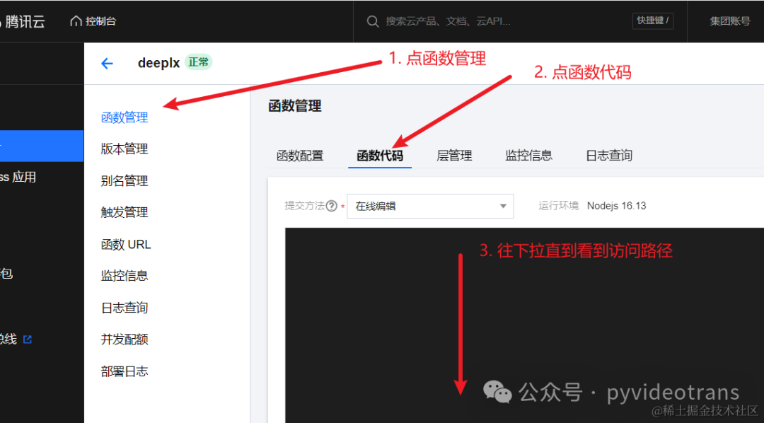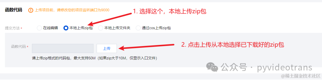 往上拉,找到函数代码区域,上传函数代码,代码下载地址是 pyvideotrans.com/dist.zip ,先去下载到本地计算机。