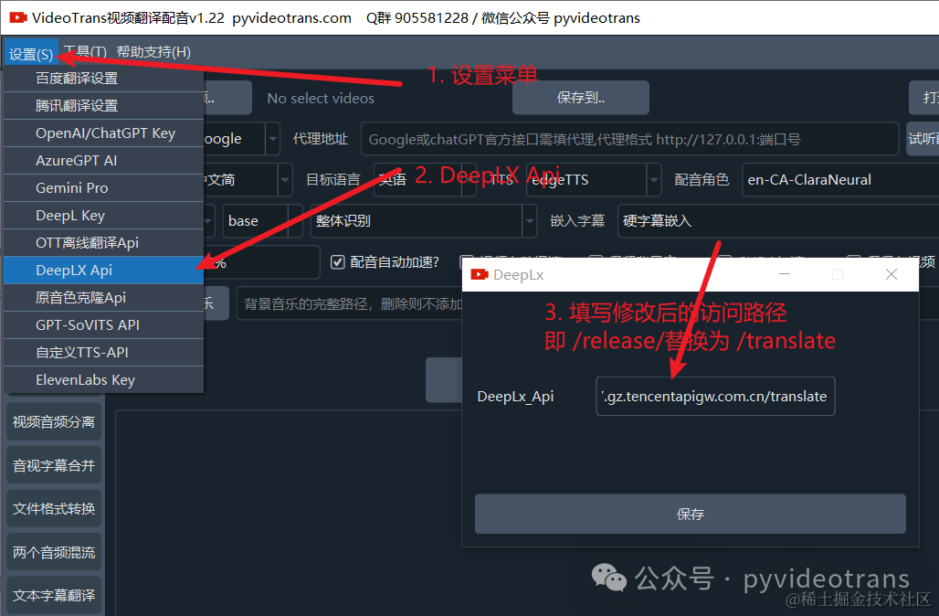 要在视频翻译配音软件中使用,打开设置菜单-DeepLX Api,将 DeepLx_Api 地址填写为修改后的访问路径就ok了。