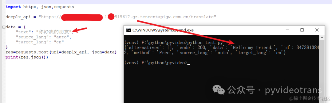 import requests deeplx_api = "https://xxxxxx-xxx9515617.gz.tencentapigw.com.cn/translate" data = { "text": "你好我的朋友", "source_lang": "auto", "target_lang": "en" } res=requests.post(url=deeplx_api, json=data) print(res.json())