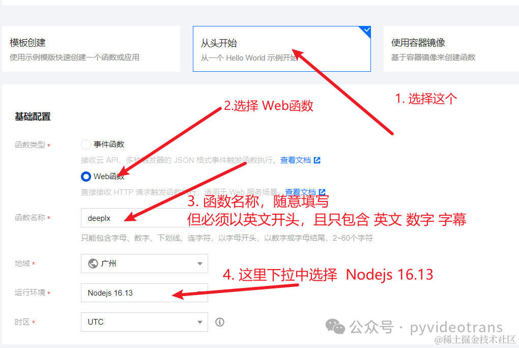 点击新建按钮后,会弹出下图界面,在下方 “基础配置” 中,依次选择 “Web函数”,填写 函数名称,选择运行环境为“Nodejs 16.13”,其他保持默认。注意函数名称必须只包含 英文、数字、下划线,而且必须以 英文字母开头。